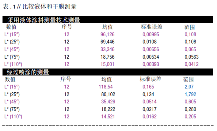 表1顯示的是同一種金屬效果涂料,液體濕膜的顏色測量和干膜顏色測度,不同觀察角度的亮度值L*。其中干膜樣品是用同種涂料在噴涂室并使用用愛色麗MA系列進行測量。